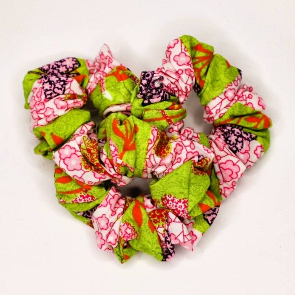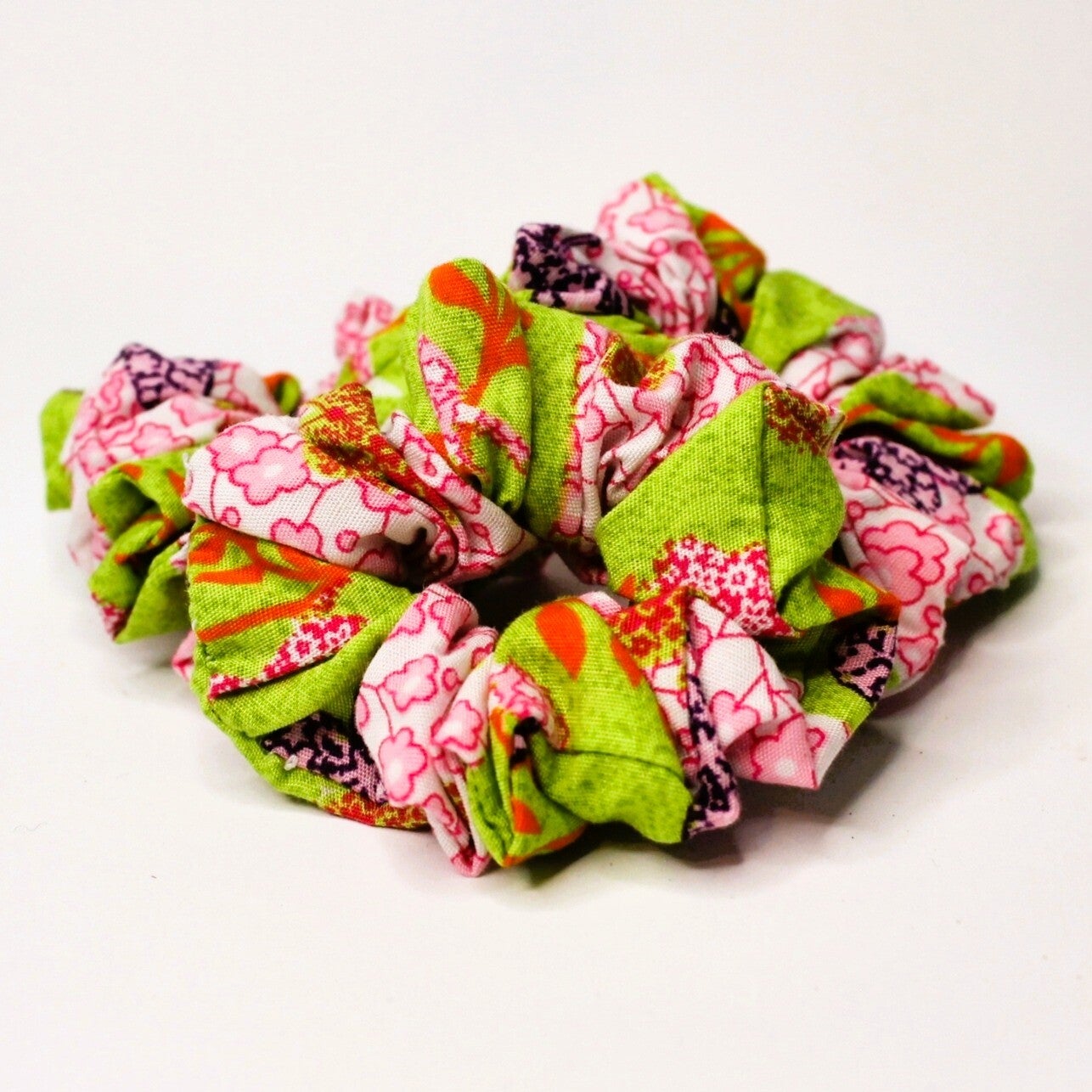 Voeg een tropische touch toe aan je look met de Tropical grove mini scrunchie van circa 6 cm in diameter. Deze katoenen scrunchie is uitgevoerd met speelse groene banen, oranje bladeren en roze grafische bloesemprints. De stof voelt heerlijk zacht en is ideaal voor zowel een messy bun als een losse staart. Perfect als unieke scrunchie voor in je haar of om je pols. Combineer met jouw favoriete zomeroutfit en straal die botanische girl power uit!