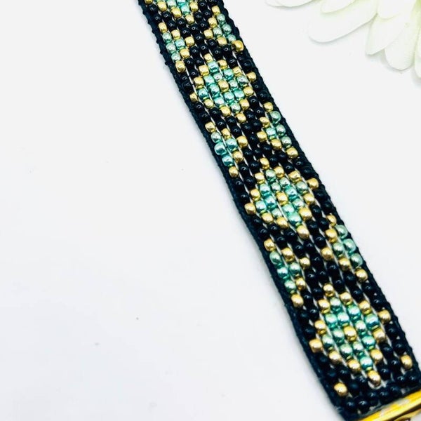 De ocean glow toho seed beads weefarmband is een verfijnde handgemaakte armband die de kalme schoonheid van de oceaan weerspiegelt. Met een elegante mix van zwart, goud en gegalvaniseerd zeegroen Toho rocailles seed beads (maat 8/0), creëert deze armband een subtiele gloed die doet denken aan het zachte licht van de oceaan bij zonsopgang.
