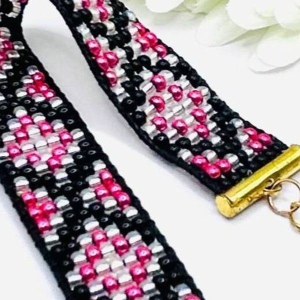 De Subtle Spark Bracelet is een handgemaakte armband die een verfijnd ruitvormig patroon combineert van zwarte, doorzichtige en een aparte roze Toho rocailles Seed Beads (maat 8/0). De subtiele speelsheid van de roze kraal voegt een delicate flair toe aan de anders rustige combinatie van zwart en transparant.