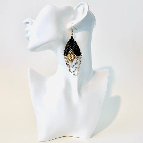 Laat je betoveren door de Noctura cascade beaded oorbellen, een uniek paar handgemaakte oorbellen waarin geometrische vormen en subtiele luxe samenkomen. Deze lange oorbellen combineren een diepzwarte driehoek met een verfijnde gouden ruit, omlijst door drie sierlijke gouden kettinkjes van roestvrij staal (RVS). Het contrast tussen zwart en goud geeft deze oorbellen een krachtige, tijdloze uitstraling die perfect past bij zowel een chique avondlook als een stijlvolle alledaagse outfit.