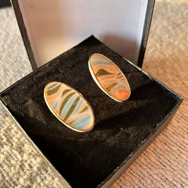 Maak je sieradencollectie compleet met de Vintage swirl studs. Deze ovale stud oorbellen zijn handgemaakt met een basis van witte polymeer klei en voorzien van een verfijnde vintage swirl afbeelding in zachte tinten groen, geel en blauw. De oorbel is gezet in een stainless steel ovale bezel en afgewerkt met een zilverkleurige stainless steel steker, waardoor hij hypoallergeen en perfect is voor gevoelige oren. De afbeelding blijft mooi doordat de bovenkant van de oorbel is afgewerkt met een laagje resin. Ook de oorsteker aan de achterkant is ingelegd in resin voor maximale stevigheid.