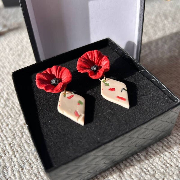 Vang de zomerse vrijheid met de Poppy terrazzo bloemen oorbellen. Deze unieke oorstekers combineren een handgemaakte klaproos van polymer clay met een speelse beige terrazzo hanger met rode en groene accenten. De subtiele spikkels in het terrazzo geven een natuurlijke, bohemian uitstraling. De oorbel is afgewerkt met een stainless steel steker aan de achterzijde van de klaproos, waardoor hij lichtgewicht en nikkelvrij is, perfect voor lange zomerdagen en festivals.