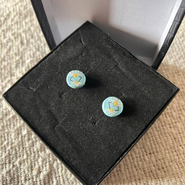 Laat je oren bloeien met de Blue Daisy Studs. Deze helderblauwe stud oorbellen zijn gemaakt van hoogwaardige polymer clay en versierd met een vrolijke daisy print. Het frisse blauw gecombineerd met de witte madeliefjes zorgt voor een speelse, zomerse uitstraling die perfect past bij zonnige dagen en boho-outfits.