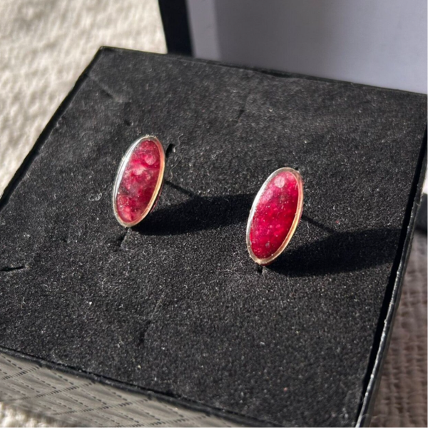 De Rosewater studs stralen een zachte, romantische elegantie uit. Deze kleine, ovale stud oorbellen zijn vervaardigd uit translucent polymer clay met subtiele roze alcoholinkt tinten die licht vangen en een dromerige glans creëren.