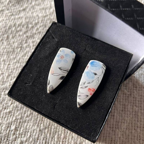 De Blue blossom dagger is een elegante, kleine oorbel met een subtiele botanische touch. Deze handgemaakte small dagger oorbel is vervaardigd uit witte polymer clay en versierd met een delicate blauwe bloemenprint met fijne lijnen en een zachte hint van roze/rood.