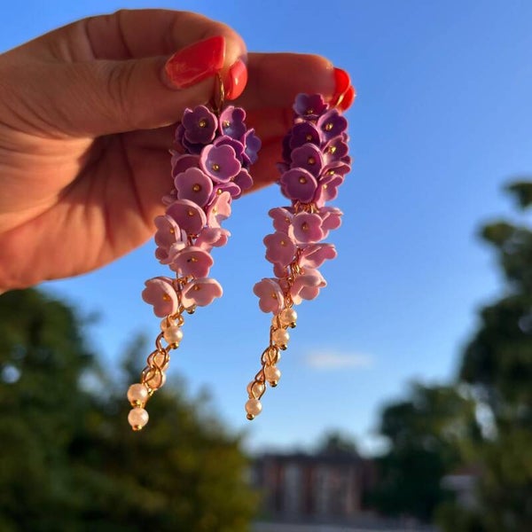 Laat je meevoeren door de zachte gloed van paarse tinten met de Purple Rain oorbel uit de Elysian Garden Collection. Met de hand gevormde bloemetjes in een prachtige gradient van lavendel tot diep violet vormen samen een sierlijke waterval van kleur. De gouden stainless steel accenten en subtiele glaskralen aan de onderzijde vangen het licht bij elke beweging en geven een magische touch aan je look.