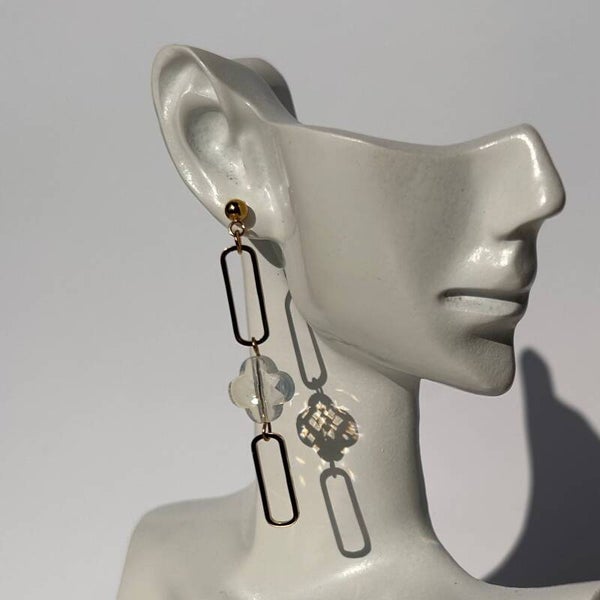 Breng balans en geluk samen in stijl met de Golden clover chain stainless steel oorbel, een verfijnde stainless steel oorbel met een modern ontwerp en een vleugje symboliek. Aan de goudkleurige ball stud hangen twee langwerpige schakels, verbonden door een transparant wit klavertje vier. Het spel van licht door het glasachtige bloemmotief zorgt voor een subtiele schittering bij elke beweging.