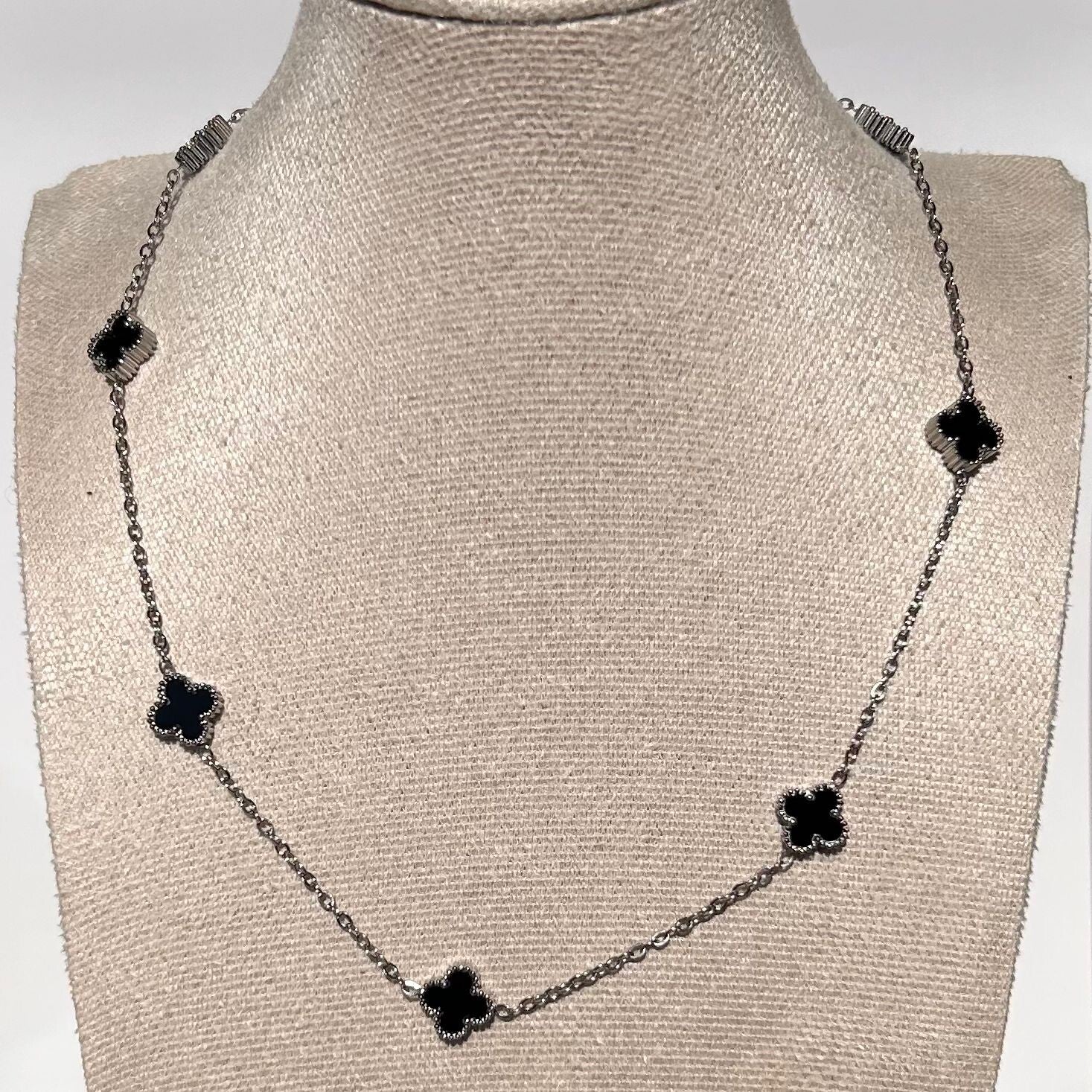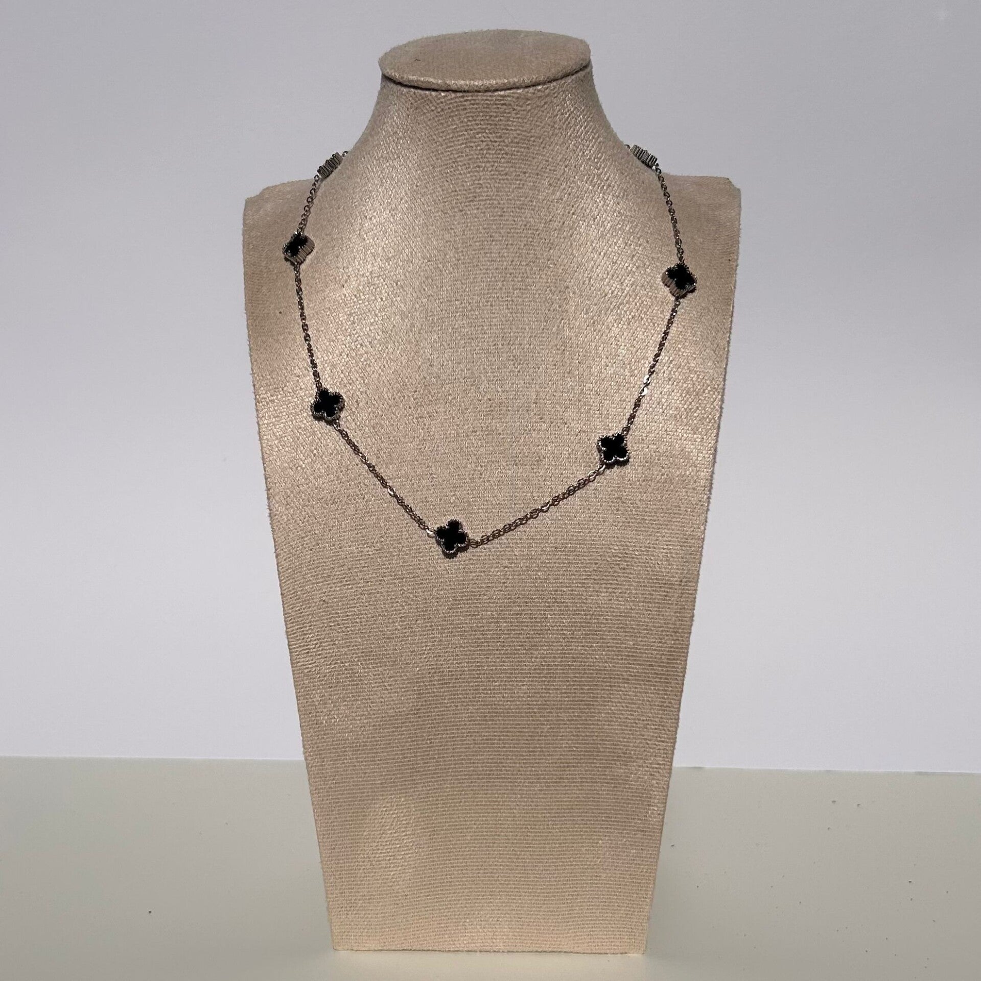 De Silver clover ketting is een elegante ketting die subtiel schittert in elke setting. De verfijnde stainless steel schakels in zilverkleur worden afgewisseld met glanzende klavervormige elementen in zwart – een stijlvol contrast dat tijdloze klasse uitstraalt.