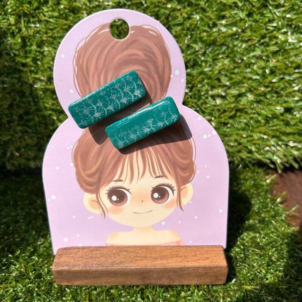 Laat je haar stralen met de Emerald Echo haarspeldjes – handgemaakt van smaragdgroene polymer clay met een verfijnd patroon dat doet denken aan art deco of waaiers van schelpen. Deze elegante alligator clips zijn een subtiele eyecatcher en geven elk kapsel een stijlvolle twist.