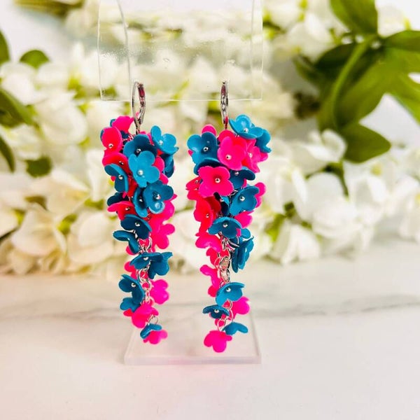 Zeg hallo tegen kleur! Electric Petals zijn handgemaakte statement oorbellen die opvallen door hun levendige kleuren en verfijnde details. De combinatie van felroze en helderblauwe bloemetjes zorgt voor een energieke en vrolijke uitstraling. Perfect voor wie durft te stralen. De bloemetjes zijn stuk voor stuk met de hand geboetseerd uit neon polymer clay en bevestigd aan een lichtgewicht stainless steel zilveren oorring.