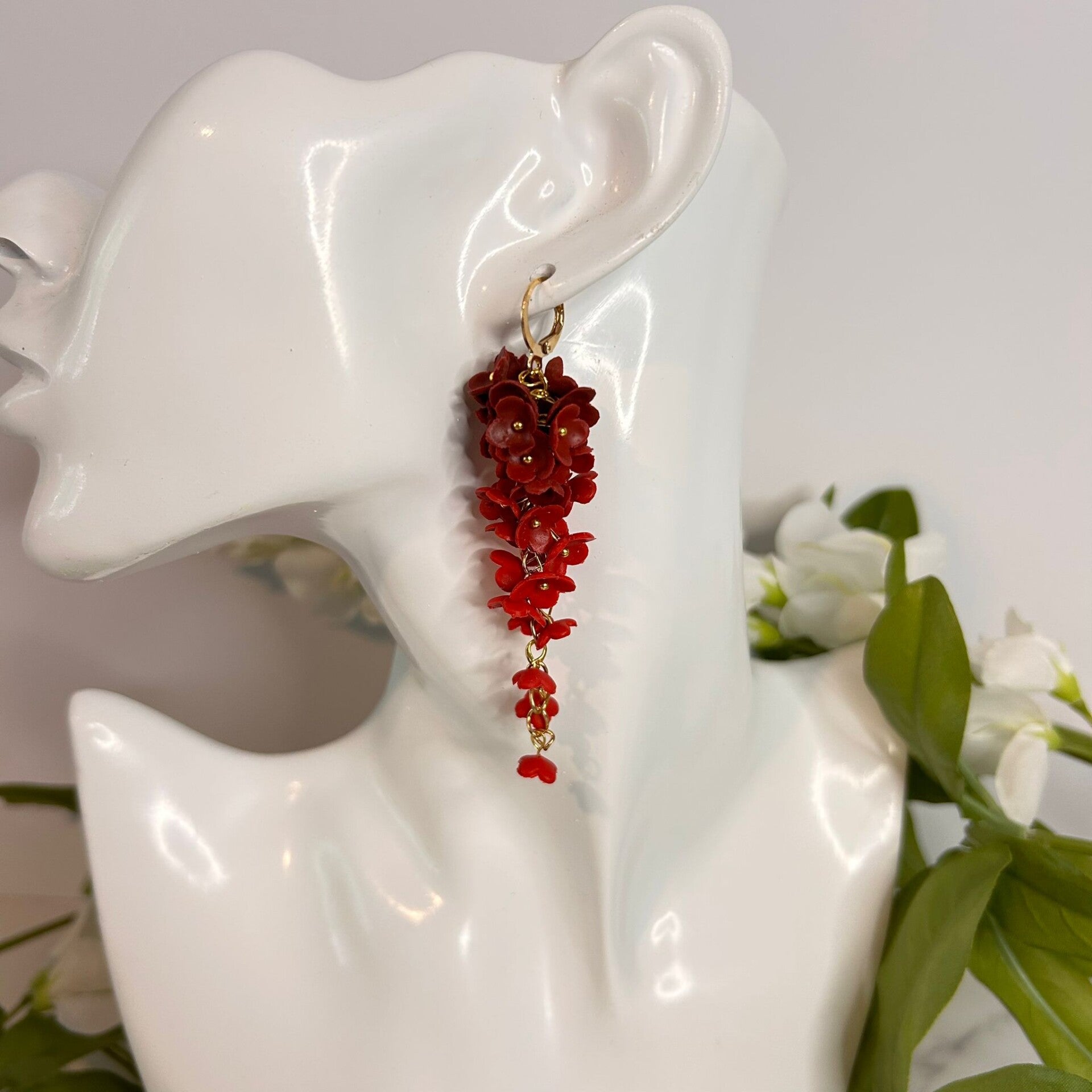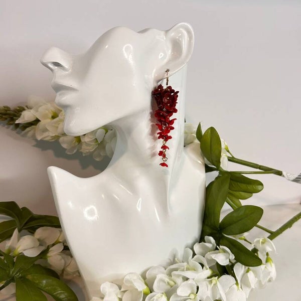 Crimson Drop is een stijlvolle, handgemaakte oorbel uit de Crimson Garden-serie. Deze sierlijke oorbellen bestaan uit een cluster van dieprode bloemetjes van polymer clay, elegant aflopend in een gouden ketting met losse bloemen. Door het subtiele vallende ontwerp en het warme kleurgebruik zijn deze oorbellen perfect voor een avondlook, najaarsoutfit of een chique gelegenheid.