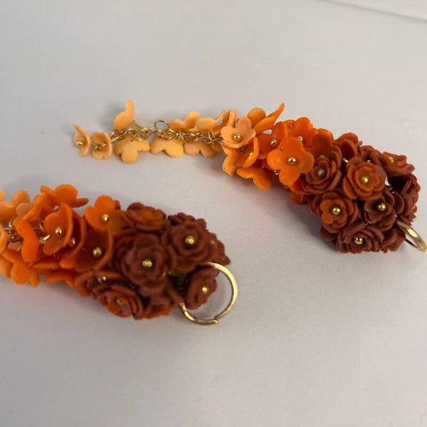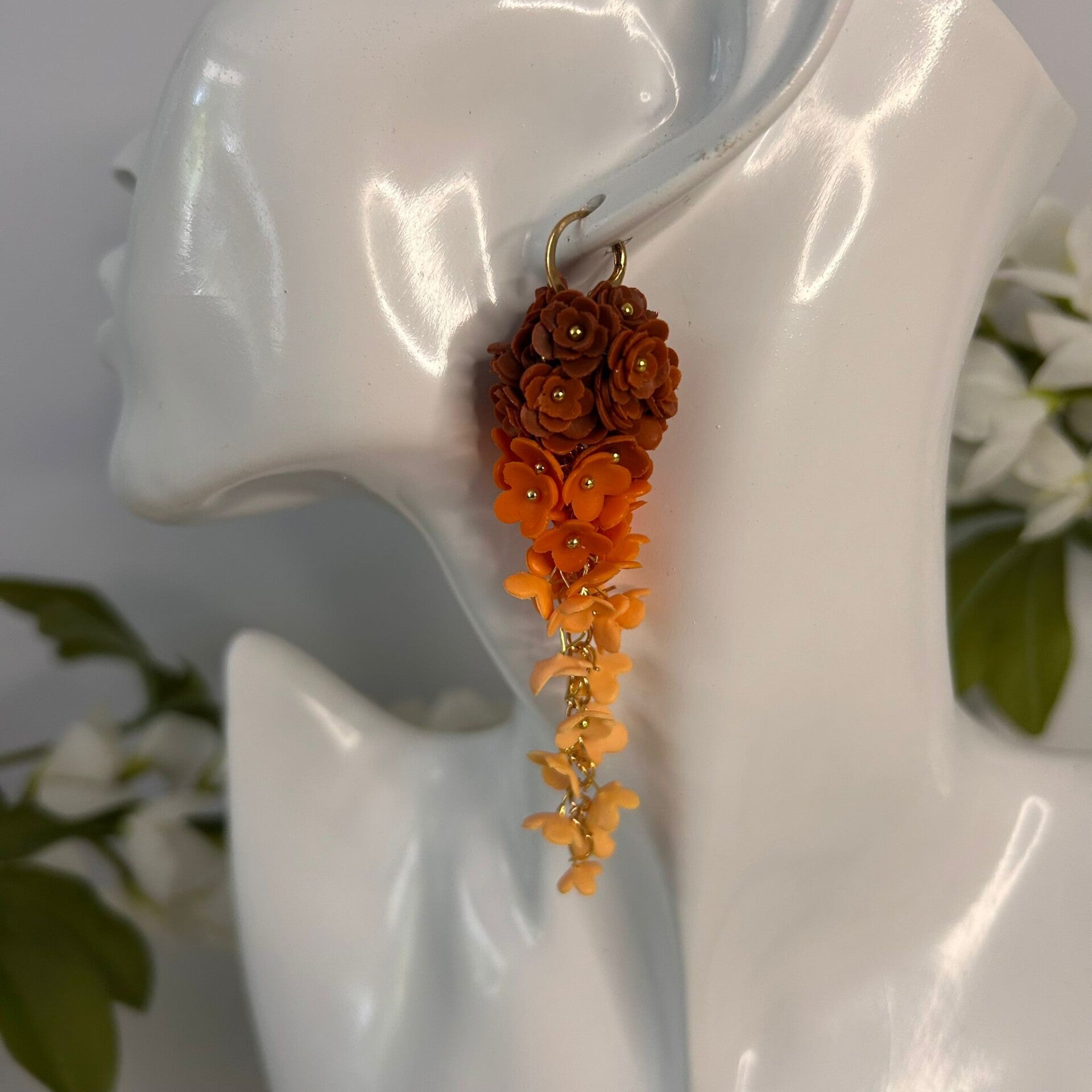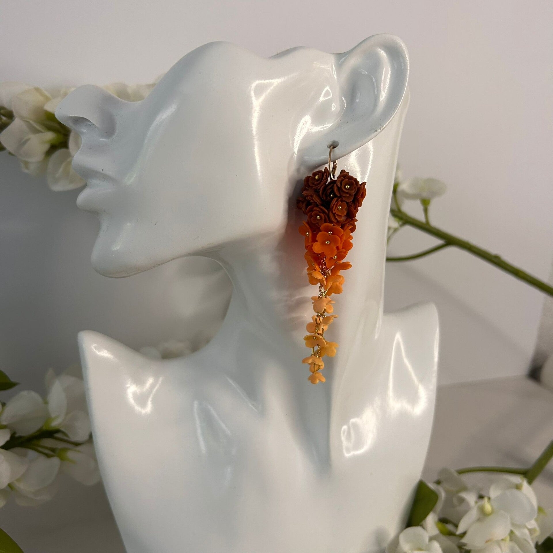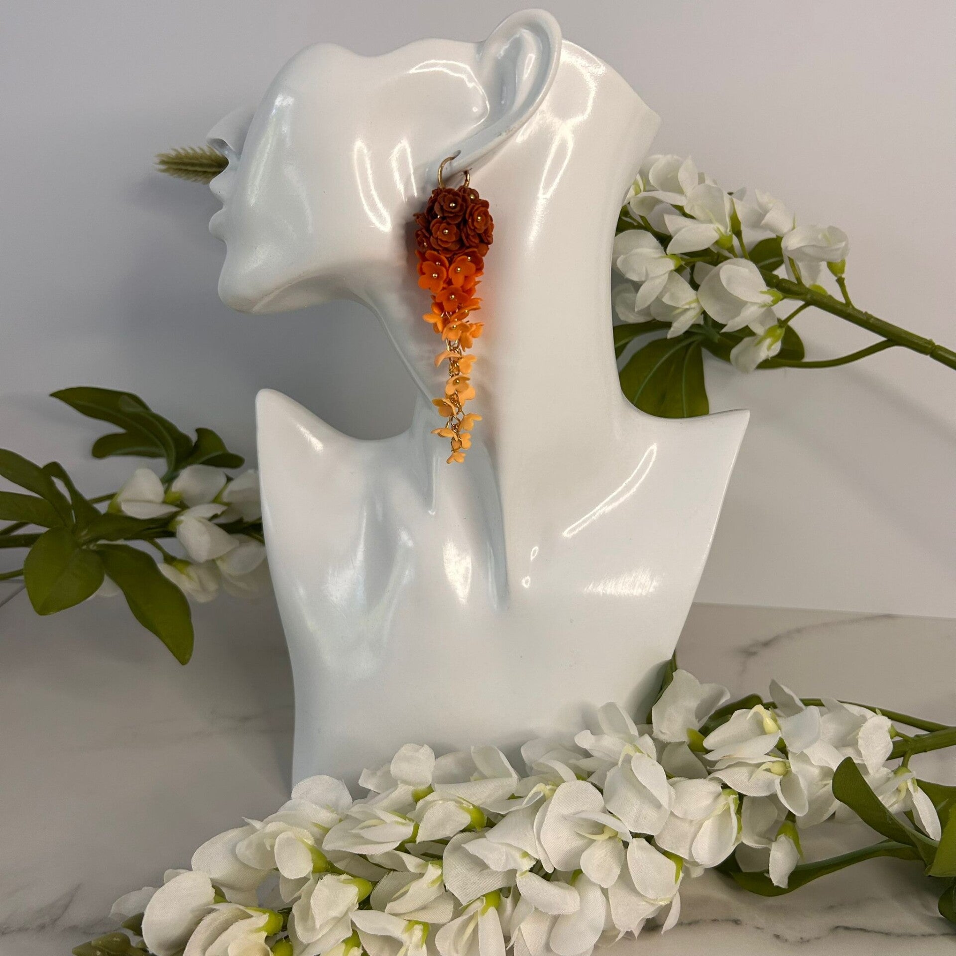 Laat je betoveren door de zachte gloed van autumn glow, een handgemaakte bloemoorbel met een warm kleurverloop van chocoladebruin naar goudgeel. De oorbel bestaat uit tientallen met de hand geboetseerde bloemetjes van polymer clay, bevestigd aan een speelse gouden ketting en stainless steel oorring.