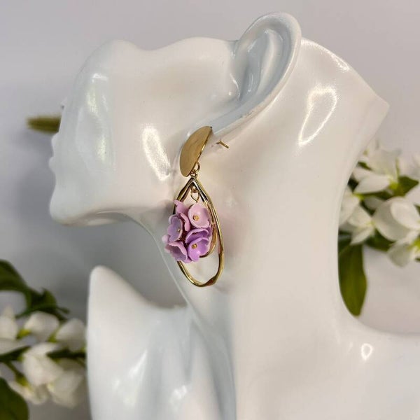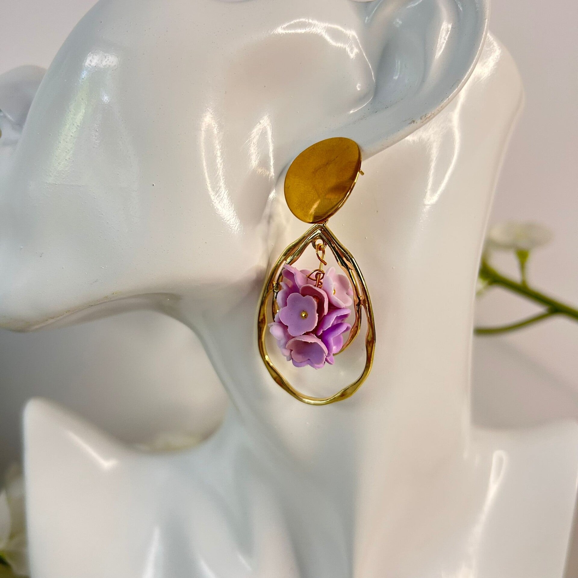 Een subtiele blikvanger met een speels karakter: de lavender royale van de Elysian garden collection combineert zachte lila in meerdere tinten bloemetjes met een stijlvolle, glanzende gouden teardrop. De handgemaakte bloemen van polymer clay lijken te zweven in het midden van het frame, waardoor een charmant en luchtig effect ontstaat.