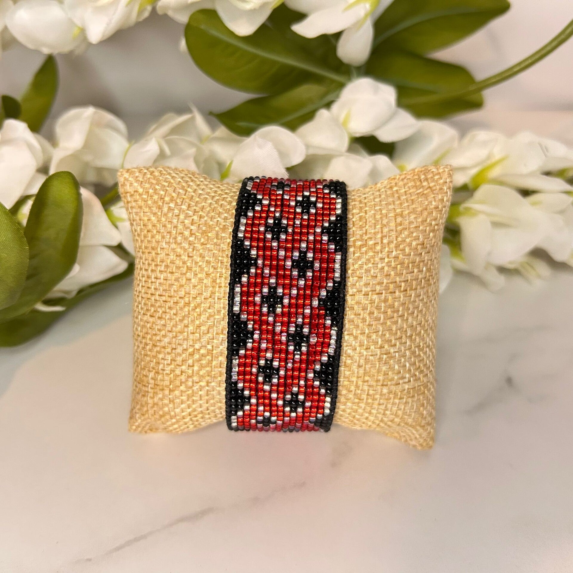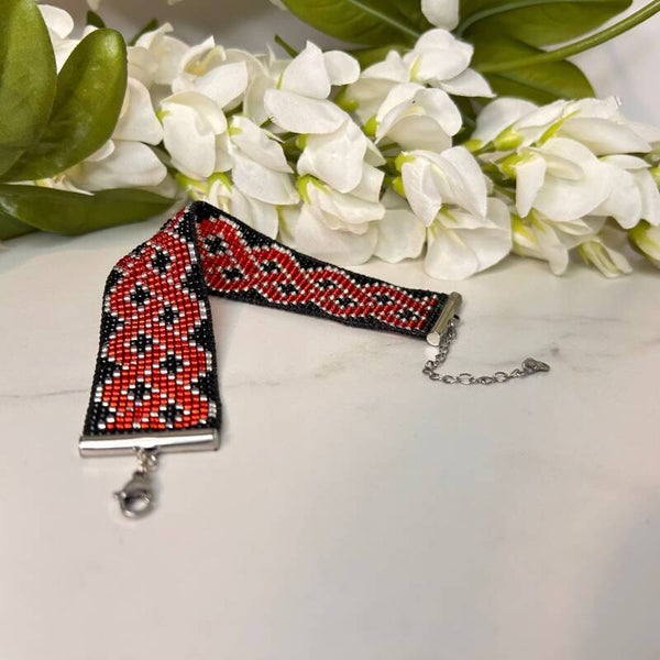 Er zit muziek in deze weefarmband. De Scarlet rhythm weefarmband brengt kleur, energie en karakter samen in één handgemaakt ontwerp. De combinatie van glanzend rood, zwart en zilver zorgt voor een speelse maar elegante uitstraling, perfect om te dragen tijdens een avond vol lichtjes en goede vibes. Elk kraaltje is met de hand geweven op een weefraam, wat deze beaded armband een luxe, ambachtelijke uitstraling geeft die echt uniek is.