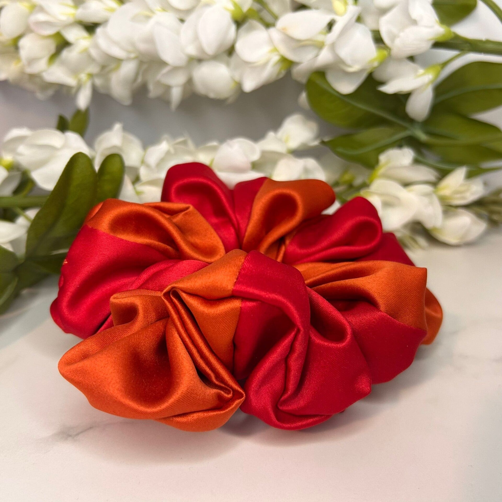 De Sunflare medium scrunchie is een vurige combinatie van rood en oranje satijn die je kapsel in één beweging laat opvallen. Het kleurblokeffect zorgt voor een speelse twist en extra diepte, perfect voor wanneer je haaraccessoire nét zo veel mag zeggen als je outfit. Met een formaat van ca. 10 cm is deze medium scrunchie ideaal voor een hoge staart, bun of half-up look. De gladde stof beschermt je haar tegen knik, pluis en breuk.