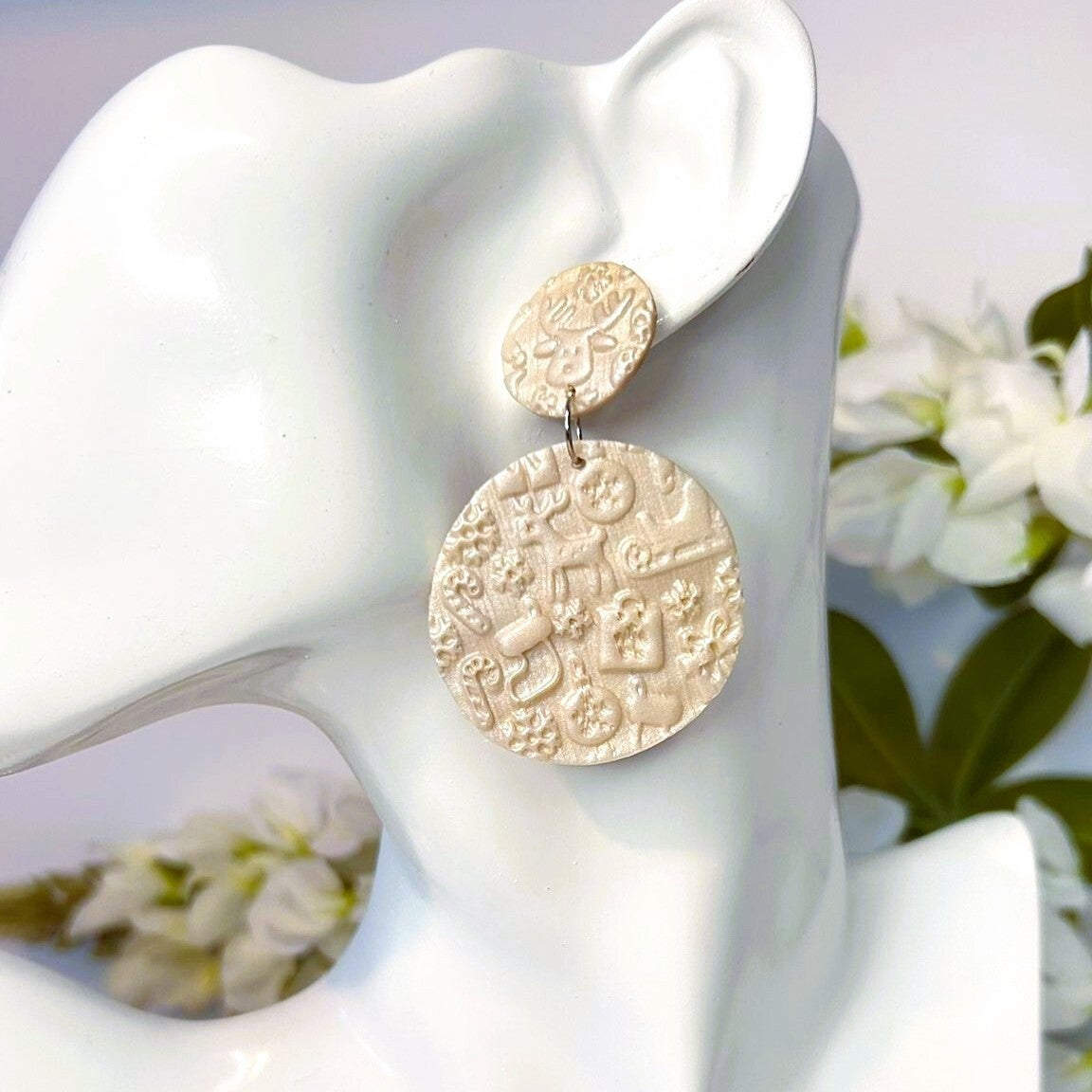 Zachte ivoortinten met een subtiele parelmoer glans en een verfijnd reliëf maken deze oorbellen elegant en tijdloos. De ronde vormen zorgen voor rust en balans, terwijl de speelse textuur het licht op een bijna zijdeachtige manier vangt. De oorbellen bewegen licht mee aan het oor en voelen comfortabel aan, waardoor ze moeiteloos de hele dag of avond gedragen kunnen worden.
