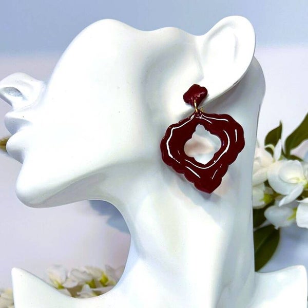 Deze hangende oorbellen hebben een diepe wijnrode tint met een zachte glans die direct een warme en feestelijke sfeer oproept. De organische vorm met subtiel golvende randen geeft het ontwerp een speels karakter, terwijl de open vorm zorgt voor lichtheid en beweging. Het gladde oppervlak vangt het licht op een elegante manier, waardoor de kleur vooral bij avondlicht extra rijk en intens oogt.