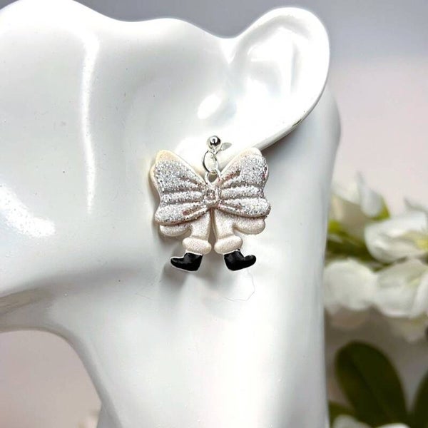 Deze feestelijke oorbellen combineren een speelse strikvorm met een subtiele zilveren glitterafwerking. De zachte champagnekleurige basis zorgt voor een elegante uitstraling terwijl de glinsterende strik direct in het oog springt. De kleine zwarte schoentjes geven het ontwerp een vrolijke knipoog en maken deze oorbellen nét even anders.