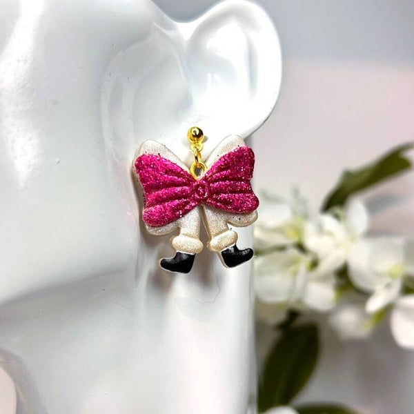 Deze Candy bow oorbellen brengen kleur en feestelijkheid samen in één speels ontwerp. De fuchsia roze glitterstrik vormt een vrolijk contrast met de zachte champagnekleurige basis en geeft deze oorbellen een echte party vibe. De kleine zwarte schoentjes zorgen voor een charmant detail dat het ontwerp luchtig en uniek maakt.