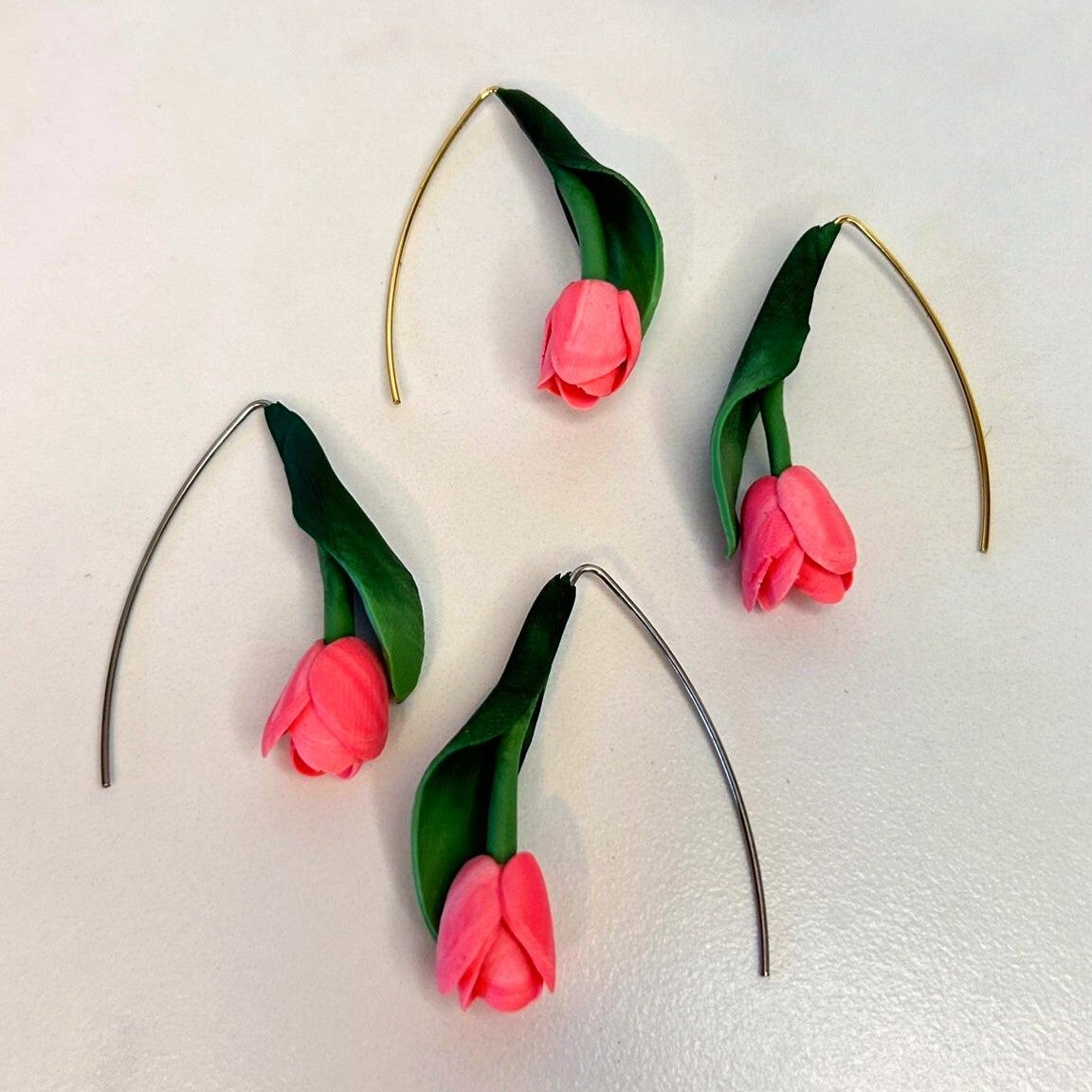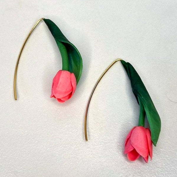 De blush tulip hook oorbellen uit de When tulips bloom collectie zijn een elegante knipoog naar het voorjaar. De handgevormde tulp in een zachte blush roze tint hangt aan een slanke oorhaak en wordt gecombineerd met een diepgroen blad voor een frisse, botanische uitstraling. Door de lengte vallen ze mooi langs je hals en geven ze je look net dat beetje extra finesse. Perfect bij neutrale tinten zoals beige, wit en zand, maar ook prachtig bij denim of een satijnen top voor een moderne boho look met een zachte touch.